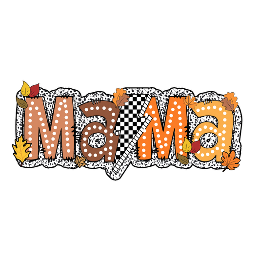 Un diseño "Mamá" colorido y divertido con hojas otoñales y lunares, perfecto para expresar amor en otoño.