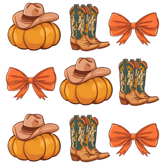 ¡Una colección divertida y festiva con sombreros de vaquero, botas adornadas, calabazas naranjas y lazos vibrantes, perfectos para las celebraciones de otoño!