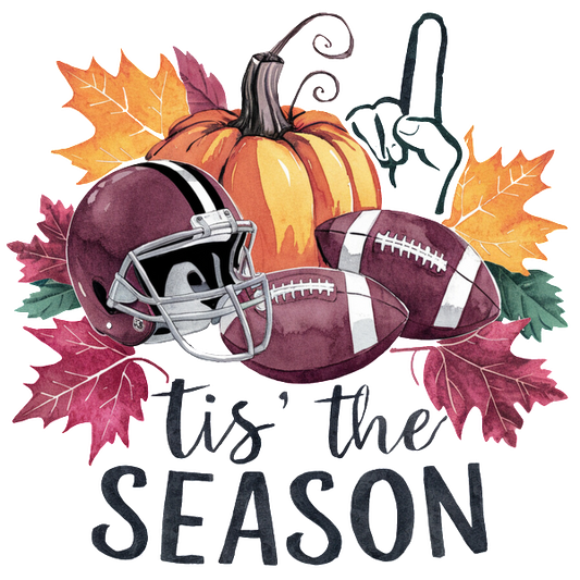 Un gráfico festivo con temática de otoño que presenta un casco de fútbol, pelotas de fútbol, una calabaza y hojas de colores con la frase "es la temporada".