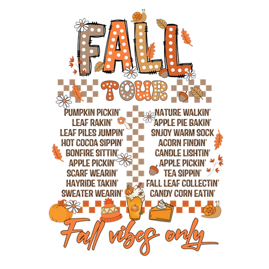 Celebre la temporada con este vibrante gráfico "Fall Tour" que incluye letras divertidas, hojas otoñales y decoraciones festivas.