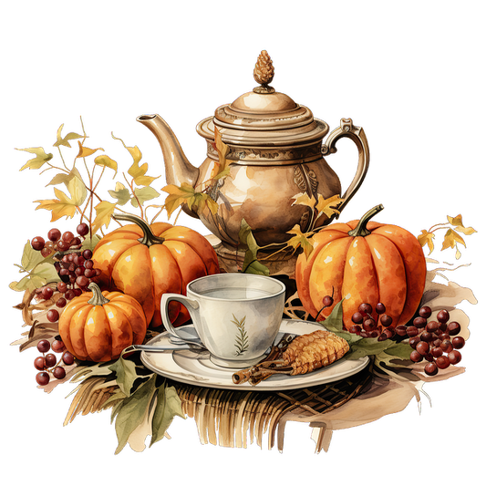 Una encantadora exhibición otoñal con una tetera decorativa, calabazas vibrantes, una delicada taza de té y un follaje exuberante.