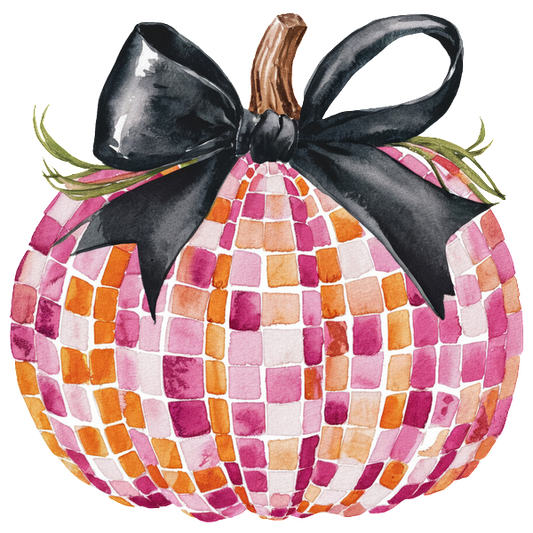 Esta calabaza vibrante presenta un patrón de mosaico en tonos rosa y naranja, rematado con un elegante lazo negro para darle un toque elegante.