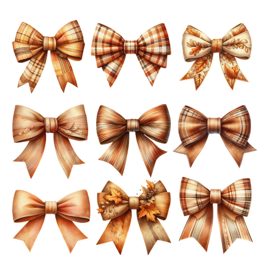 Una colección de diez lazos decorativos bellamente elaborados en cálidos colores otoñales, con diversos patrones y texturas.