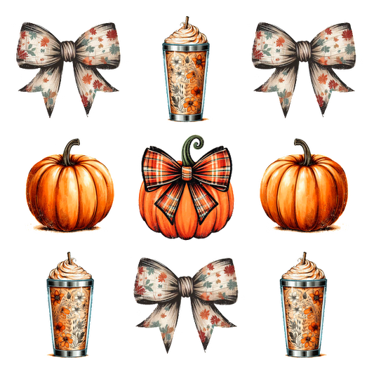 Este patrón festivo presenta calabazas, lazos decorativos y tazas inspiradas en el otoño, perfectos para una atmósfera otoñal acogedora.