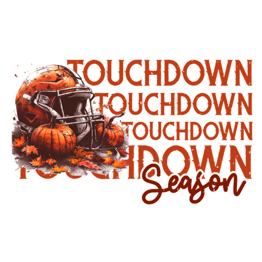 Celebre el fútbol de otoño con este diseño vibrante que presenta un casco de fútbol, calabazas y la frase "Touchdown Season".