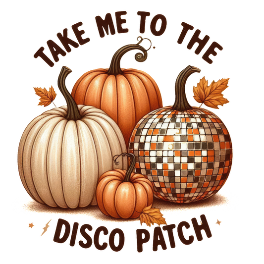 Una divertida ilustración que presenta cuatro calabazas, incluida una calabaza con forma de bola de discoteca, con el divertido texto "Llévame a la discoteca".