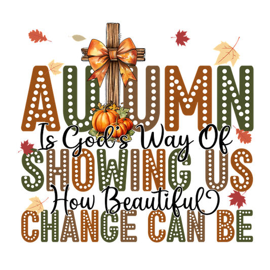 Un gráfico vibrante con temática otoñal que presenta una cruz, una calabaza y hojas coloridas, y celebra la belleza del cambio con un mensaje sincero.