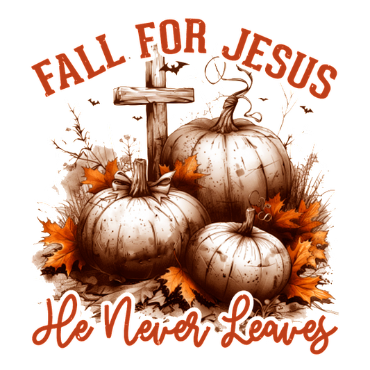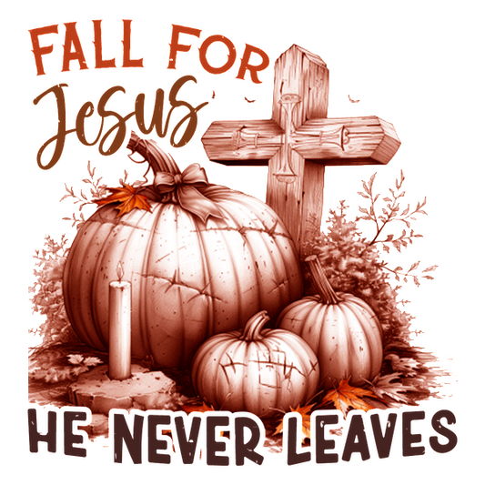 Un cálido diseño con temática otoñal que presenta calabazas, hojas otoñales y una cruz, con la frase "Enamórate de Jesús, Él nunca te abandona".