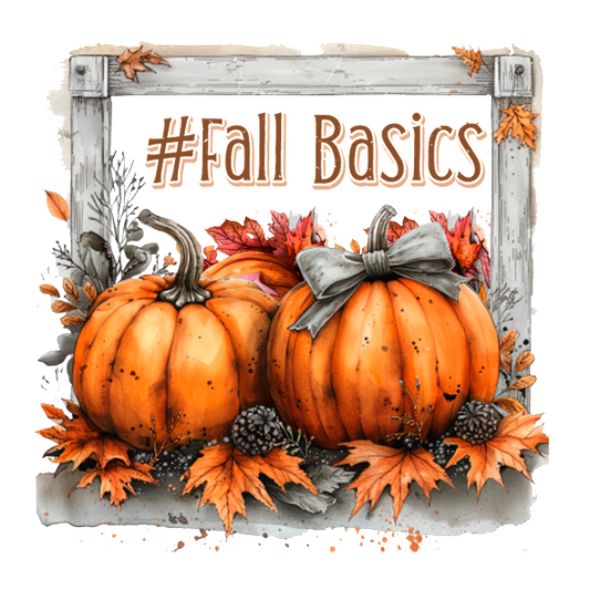 Un encantador gráfico con temática otoñal que presenta dos calabazas vibrantes, hojas coloridas y un lazo decorativo, perfecto para las celebraciones de otoño.