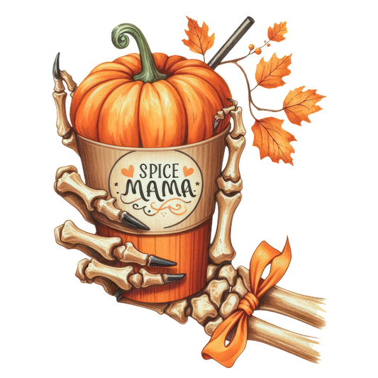 Una ilustración caprichosa que presenta una calabaza en una maceta rústica etiquetada "Spice Mama", sostenida por manos esqueléticas con hojas de otoño.
