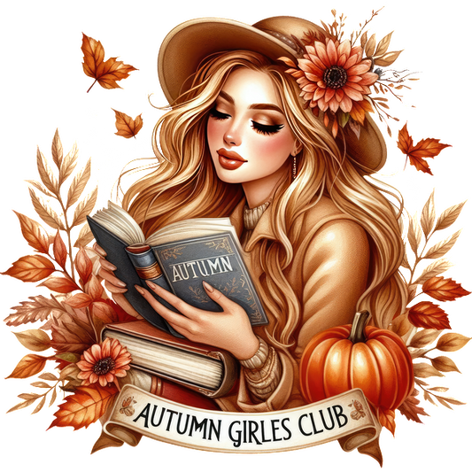 Acogedora ilustración de otoño que presenta a una niña con sombrero leyendo un libro, rodeada de girasoles, hojas y una calabaza.
