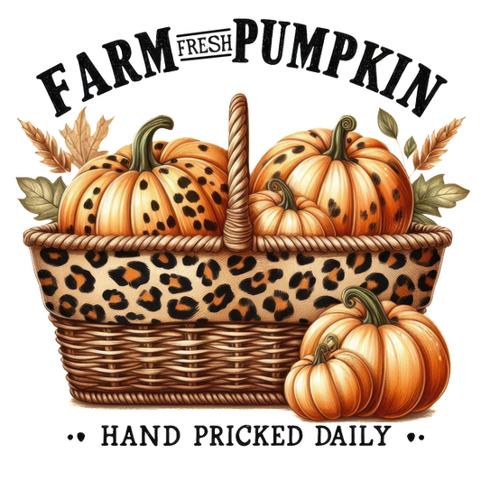 Una encantadora canasta con calabazas seleccionadas a mano en color naranja vibrante, acentuada con un elegante estampado de leopardo y hojas de otoño.