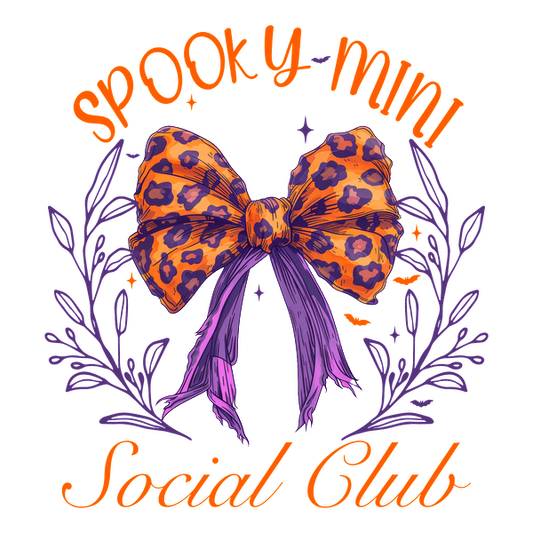 Una ilustración caprichosa que presenta un lazo con estampado de leopardo en tonos naranja y morado vibrante, rodeado de follaje decorativo y el texto "Spooky Mini Social Club".
