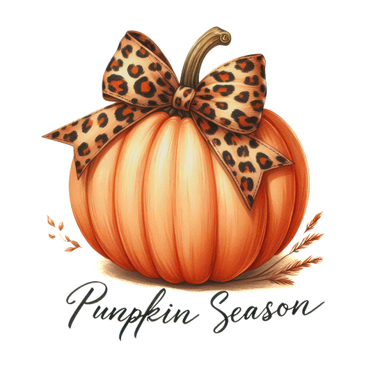 Una calabaza festiva adornada con un elegante lazo con estampado de leopardo, que celebra el ambiente acogedor de la temporada de calabazas.