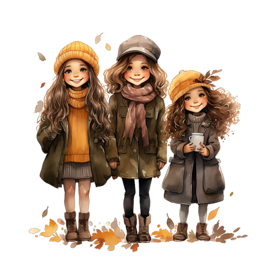 Una encantadora ilustración de tres niñas con elegantes atuendos otoñales, con colores cálidos, sombreros y suéteres acogedores en medio de las hojas que caen.