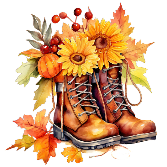 Un par de botas de montaña marrones adornadas con alegres girasoles, calabazas y hojas otoñales, que capturan la esencia del otoño.