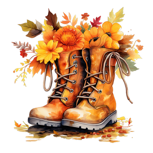 Un encantador par de botas naranjas rebosantes de vibrantes flores y hojas otoñales, perfectas para celebrar la belleza del otoño.