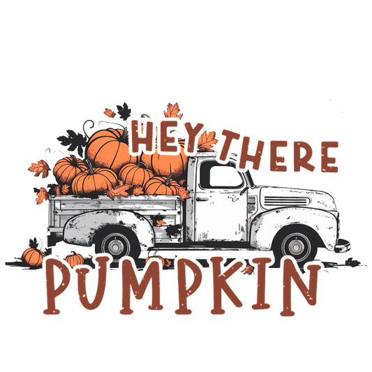 Un encantador camión vintage lleno de calabazas, acompañado del divertido texto "Hola calabaza", captura la esencia del otoño.