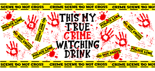 A bold and dramatic design featuring crime scene tape, bloody handprints, and the word "CRIME" prominently displayed.UV Transfers heat press transfers