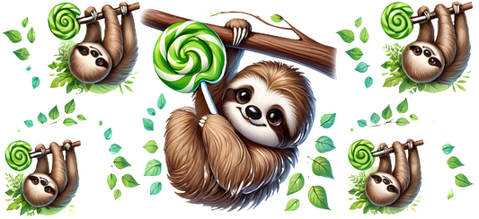 Adorable cartoon sloths hanging from branches, playfully holding green swirl lollipops amidst leaves, creating a whimsical and fun scene.UV Transfersdtf regular iron