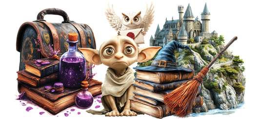 a toy of dobby the house elf standing next to a paved castleUV Transfers