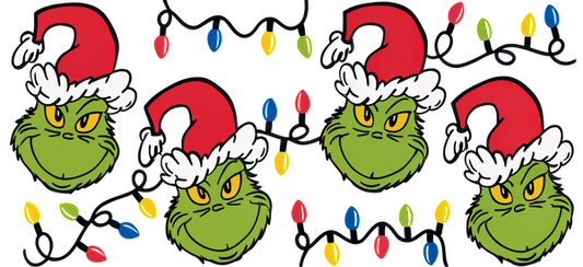 Four playful Grinch faces in Santa hats, surrounded by colorful Christmas lights, capturing the fun spirit of the holiday season.UV Transfers dtf transfers