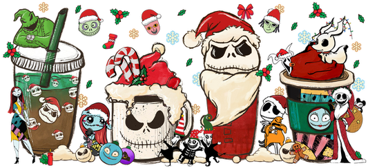 A whimsical holiday-themed illustration featuring festive characters from "The Nightmare Before Christmas" alongside decorated drink cups and candy canes.UV Transfers dtf transfers