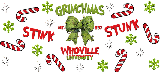 Celebrate a whimsical "Grinchmas" with playful candy cane designs and festive colors, featuring the vibrant spirit of Whoville!UV Transfers heat press transfers
