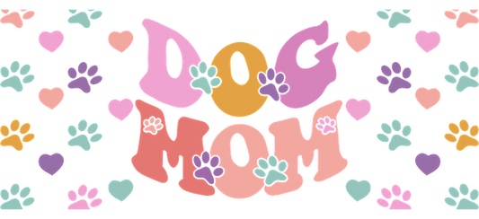 Dog mom logo with colorful hearts and paw prints.UV Transfers