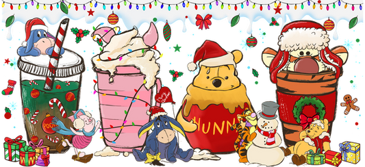 A festive gathering of beloved characters from Winnie the Pooh, celebrating Christmas with cheerful hats and playful decorations.UV Transfers heat press transfers