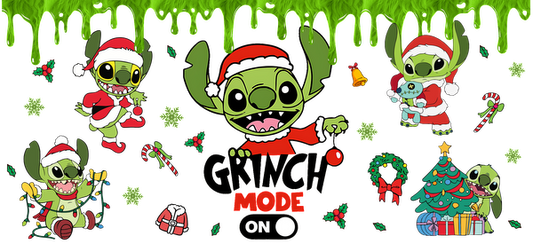 A vibrant and whimsical holiday graphic featuring Stitch in festive attire, celebrating Christmas with decorations and a playful "Grinch Mode" theme.UV Transfers heat press transfers