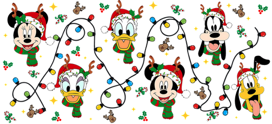 Celebrate the holidays with this cheerful illustration featuring Mickey and friends in festive attire surrounded by Christmas lights and decorations!UV Transfers dtf transfers