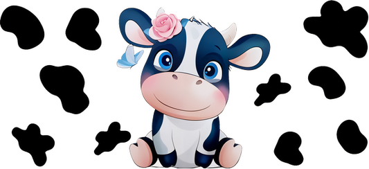 This adorable cartoon cow features big blue eyes, a pink flower on its ear, and a playful expression.UV Transfers