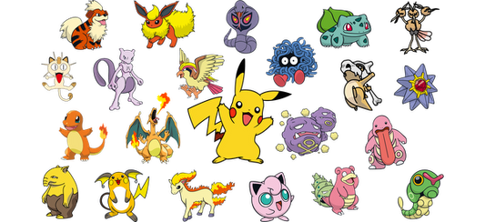 Una colección vibrante de personajes de Pokémon que incluye favoritos como Pikachu, Charizard y Eevee, mostrando varios tipos y estilos. Transferencias UV