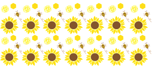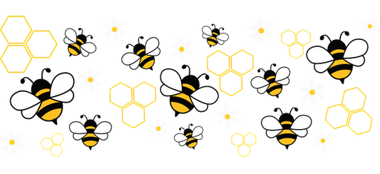 Un patrón divertido con abejas zumbando, panales de color amarillo vibrante y alegres flores blancas, perfecto para un diseño con temática de la naturaleza. Transferencias UV