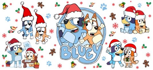Festively themed illustration of animated characters from "Bluey," wearing Santa hats and surrounded by Christmas decorations and playful scenes.UV Transfersdtf regular iron