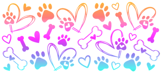 A collection of different designs of hearts, hearts with paws, and dog bones.UV Transfers