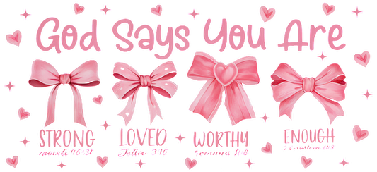 A cheerful design featuring pink bows and hearts, proclaiming uplifting messages like "Strong," "Loved," "Worthy," and "Enough."UV Transfers heat press transfers