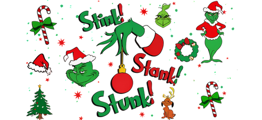 A colorful festive illustration featuring the Grinch, holiday decorations, and the playful phrase "Stink! Stank! Stunk!" perfect for Christmas cheer.UV Transfersdtf regular iron