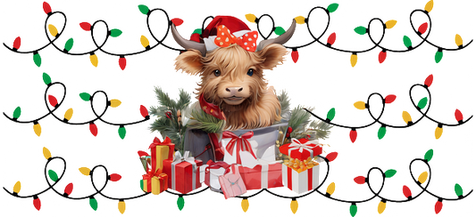 A cheerful cow wearing a festive hat peeks out from a gift box surrounded by colorful holiday lights and presents.UV Transfers dtf prints