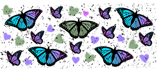 Un patrón caprichoso que presenta mariposas y corazones coloridos en tonos vibrantes de azul, verde, morado y rosa. Transferencias UV
