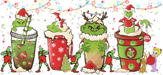A festive illustration featuring the Grinch and whimsical holiday-themed drinks, adorned with cheerful decorations and playful elves.UV Transfersdtf regular iron