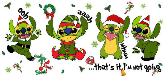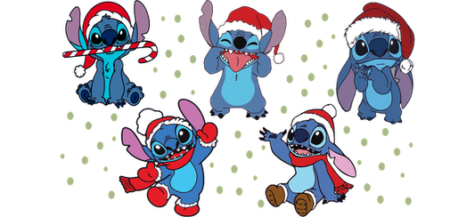 A festive collection of Stitch characters dressed in joyful holiday outfits, showcasing their playful spirit with fun seasonal accessories.UV Transfersdtf regular iron