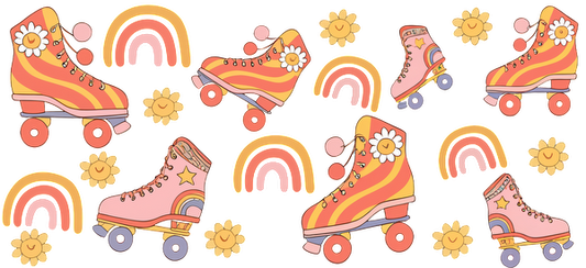 A vibrant and playful pattern featuring colorful retro roller skates, flowers, rainbows, and cheerful suns.UV Transfers dtf transfers