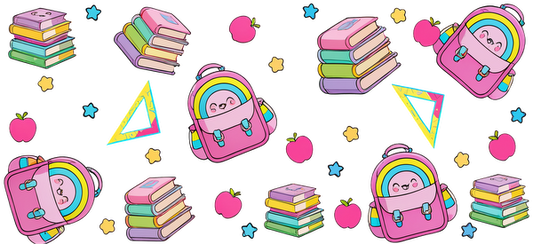 A colorful, playful pattern featuring cute pink backpacks, stacked books, apples, and geometric shapes, perfect for a cheerful design.UV Transfersdtf regular iron