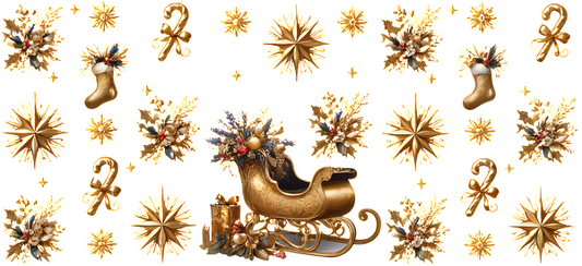 A beautifully decorated golden sleigh adorned with festive flowers and surrounded by snowflakes, candy canes, and Christmas stockings.UV Transfers heat press transfers