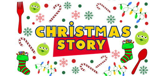 A festive and colorful graphic featuring playful holiday decorations, candy canes, Christmas ornaments, and the title "Christmas Story" in vibrant letters.UV Transfers dtf transfers