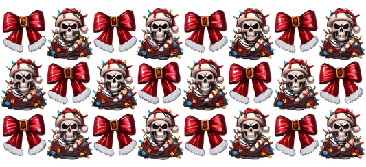 A festive pattern featuring cheerful skulls wearing Santa hats adorned with colorful lights, alongside vibrant red bows with white fur.UV Transfers heat press transfers