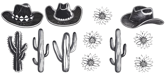 A charming collection of black and white illustrations featuring stylish cowboy hats and various cacti, perfect for western-themed designs.UV Transfers dtf transfers