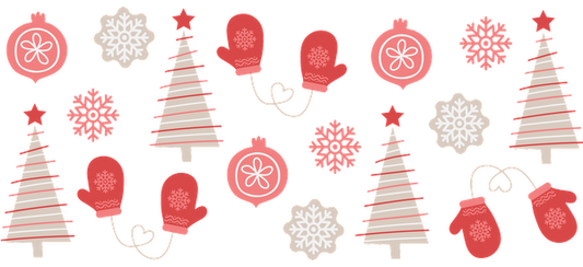 A cheerful Christmas-themed pattern featuring decorated trees, mittens, snowflakes, and ornaments in red and white hues.UV Transfers dtf transfers